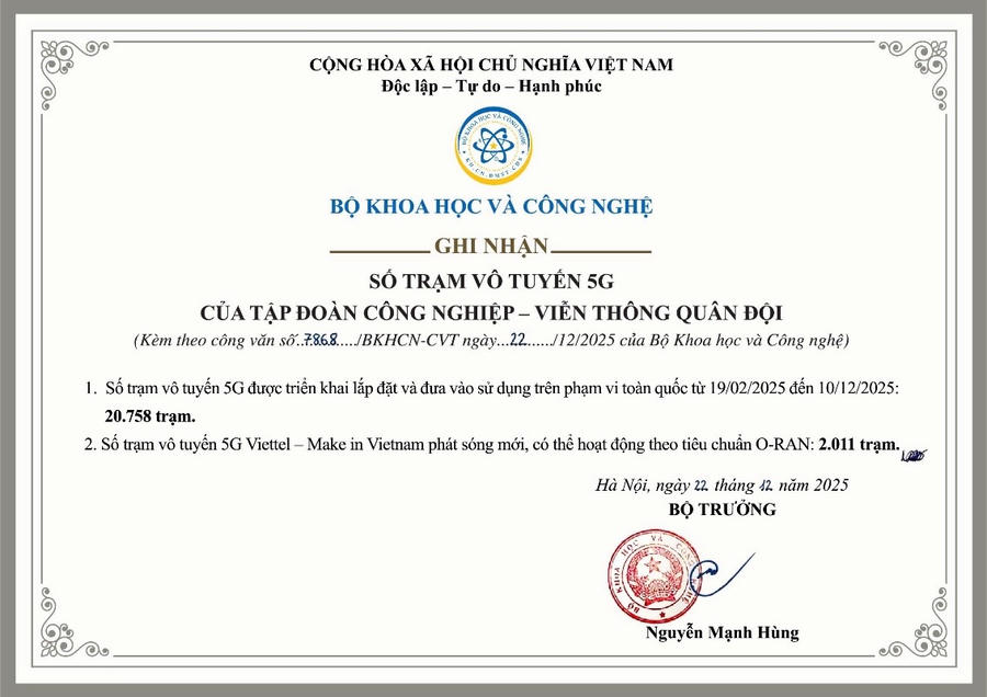Trong văn bản ban hành ngày 22/12/2025, Bộ Khoa học và Công nghệ khẳng định Viettel đã nghiêm túc thực hiện nhiệm vụ được giao, tích cực mở rộng vùng phủ sóng 5G trên phạm vi toàn quốc. Bộ đánh rất giá cao kết quả triển khai nhanh, quy mô lớn của Viettel và đề nghị doanh nghiệp tiếp tục phát huy vai trò tiên phong, nòng cốt trong phát triển hạ tầng viễn thông và hạ tầng số quốc gia.
