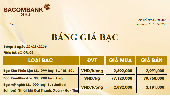 Tại Sacombank-SBJ, giá bạc miếng 999 loại 1 lượng được niêm yết ở mức 2,892 - 2,991 triệu đồng/lượng (mua – bán). Đối với bạc thỏi 999 loại 1kg, thương hiệu này cũng ghi nhận mức giảm, hiện giao dịch tại 77,1 - 79,7 triệu đồng/kg.