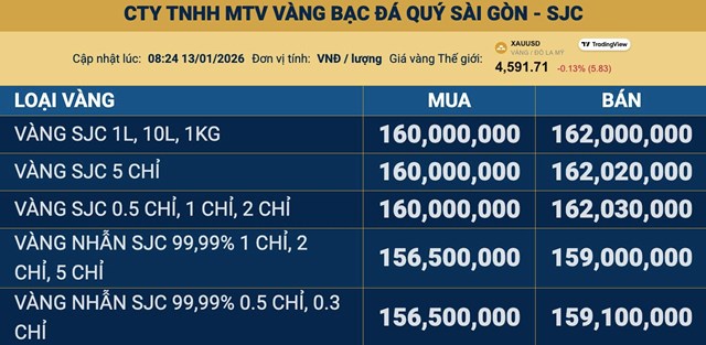 Hiện công ty Vàng bạc Đá quý Sài Gòn (SJC), Tập đoàn Doji, Phú Quý và hệ thống PNJ đều giữ nguyên giá ở cả hai chiều mua vào và bán ra so với hôm qua. Theo đó, giá mua được nâng lên 160 triệu đồng/lượng, trong khi giá bán ra chạm mốc 162 triệu đồng/lượng.