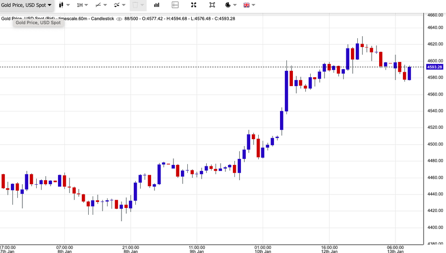 Chốt phiên giao dịch, giá vàng giao ngay tăng 2,2% lên 4.609,58 USD/ounce, sau khi đạt đỉnh lịch sử ở mức 4.629,94 USD. Giá vàng giao tháng 2 cũng đóng cửa tăng 2,5% lên 4.614,70 USD/ounce.