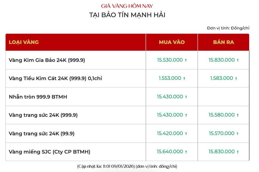 Vàng Kim Gia Bảo của Bảo tín Mạnh Hải niêm yết tại 155,3 - 158,3 triệu đồng/lượng.