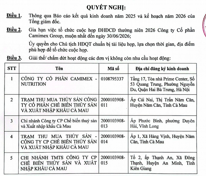 Ở một diễn biến khác, ngày 20/3/2026, Camimex Group đã ban hành Nghị quyết về cuộc họp thường kỳ quý I/2026.