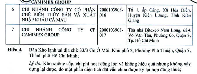 Bên cạnh đó, doanh nghiệp cũng giải thể/chấm dứt hoạt động một số đơn vị không còn nhu cầu hoạt động như: Công ty cổ phần Camimex-Nutrition; Chi nhánh Công ty cổ phần Camimex Group; Chi nhánh Công ty cổ phần Chế biến thủy sản và Xuất nhập khẩu Cà Mau; Chi nhánh thu mua thủy sản Công ty cổ phần chế biến thủy sản và Xuất nhập khẩu Cà Mau;...